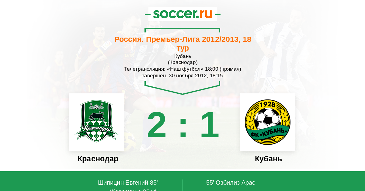 Мы приветствуем Вас на третьем в сезоне краснодарском дерби, которое пройдет в рамках 18-го тура российской Премьер-лиги. 10 августа нынешнего года "Кубань" в чемпионате обыграла "Краснодар" со счетом 2:1, а 30 октября в кубковом поединке - 1:0, посему сегодня подопечные Славолюба Муслина наверняка настроены на реванш. Прямую текстовую трансляцию встречи проведет комментатор Soccer.Ru Антон Сазонтов. Добро пожаловать!