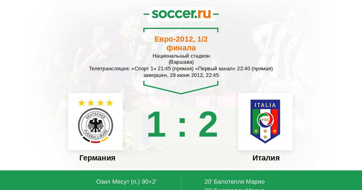 Балотелли Марио (Кассано Антонио) - 0:1 Кассано на левом фланге атаки одним ловким движением оставил в дураках Хуммельса с Боатенгом и выполнил подачу на линию вратарской, а Балотелли, опередив Бадштубера, головой отправил мяч в противоход Нойеру!!!