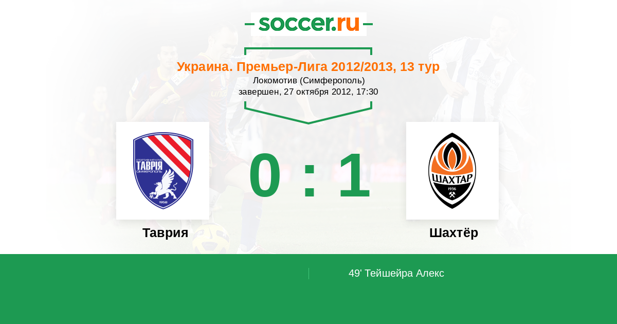 Мы приветствуем Вас на матче 13-го тура украинской Премьер-лиги, в котором "Таврия" принимает безоговорочного лидера - донецкий "Шахтер". Прямую текстовую трансляцию проведет комментатор Soccer.Ru Антон Сазонтов. Добро пожаловать!