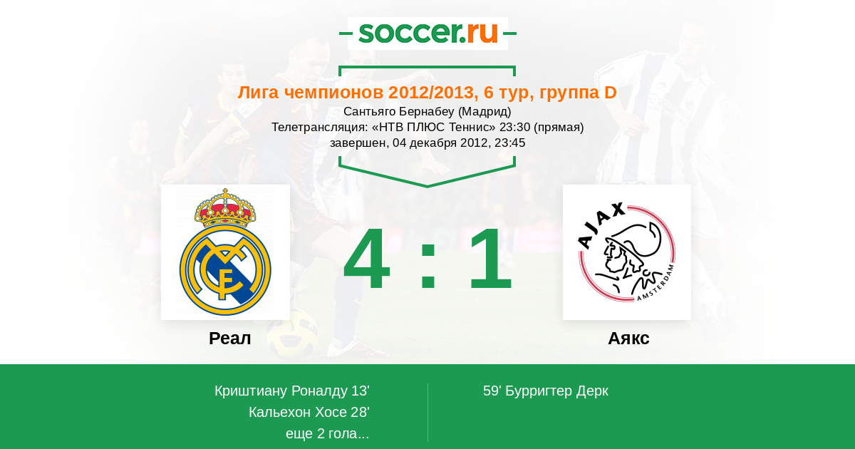 Шестую победу в трех последних розыгрышах Лиги Чемпионов одерживает над "Аяксом" "Реал" с общей разницей мячей 20:2.