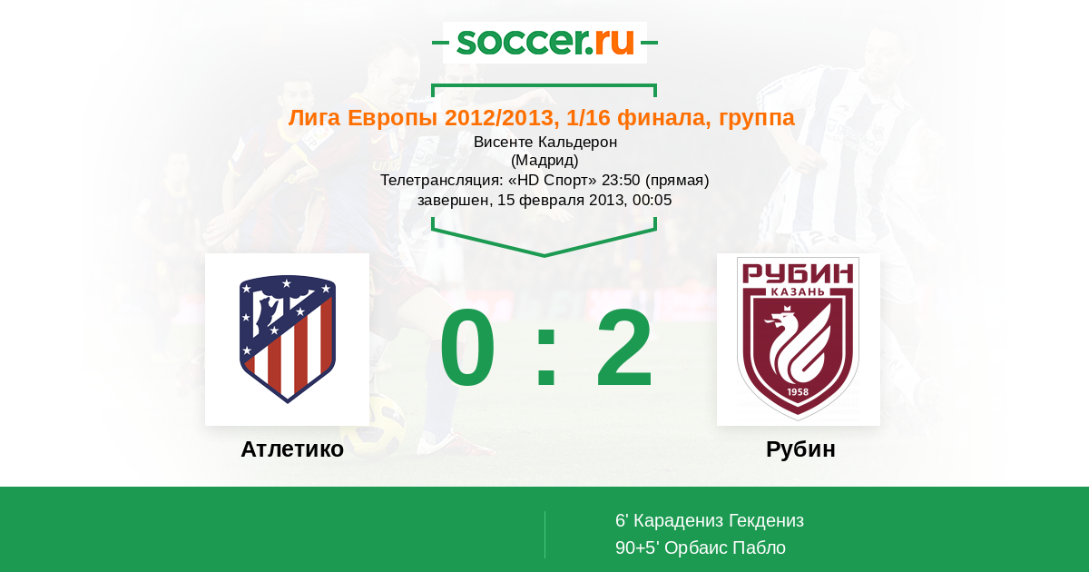Мы приветствуем Вас на первом матче 1/16 финала Лиги Европы, в котором мадридский "Атлетико" принимает "Рубин". Прямую текстовую трансляцию проведет комментатор Soccer.Ru Антон Сазонтов. Добро пожаловать!
