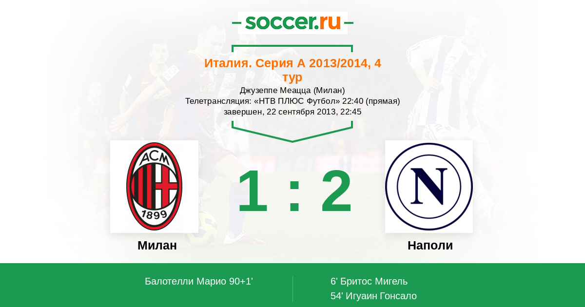 Мы приветствуем Вас на матче 4-го тура итальянской Серии А, в котором "Милан" принимает "Наполи". Прямую текстовую трансляцию проведет комментатор Soccer.Ru Антон Сазонтов. Добро пожаловать!