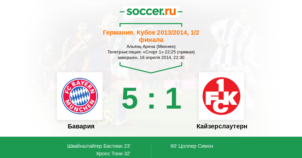 Мы приветствуем Вас на полуфинальном матче Кубка Германии, в котором "Бавария" принимает "Кайзерслаутерн". Прямую текстовую трансляцию проведет комментатор Soccer.Ru Антон Сазонтов. Добро пожаловать!