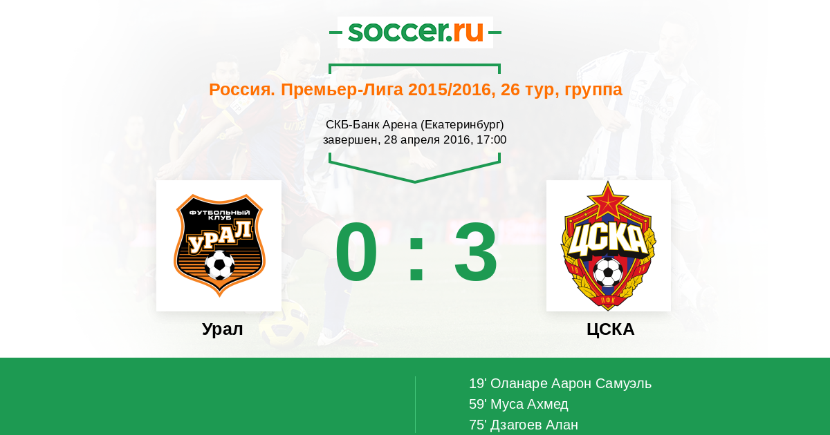 Здравствуйте, уважаемые любители отечественного футбола! Сегодня в 17.00 по московскому времени состоится перенесенный матч 26-го тура Чемпионата России между "Уралом" и "ЦСКА". Встреча должна была пройти по запланированному ранее графику 30-го апреля, но в связи с тем, что в полуфинале Кубка "армейцы" на удивление легко разобрались с "Краснодаром", обыграв тех со счетом 3-1, и вышли в финал, который состоится 2 мая, то решением лиги матч был поставлен на 28-ое число. Помогать вам наблюдать за этой игрой будет Роман Земко, оставайтесь на soccer.ru!