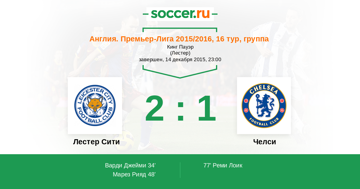 Варди Джейми (9) (Марез Рияд (26)) - 1:0 Варди, получив мяч от Канте, отправил его на фланге Марезу, а сам открылся в штрафной и в касание замкнул отличную подачу алжирца!