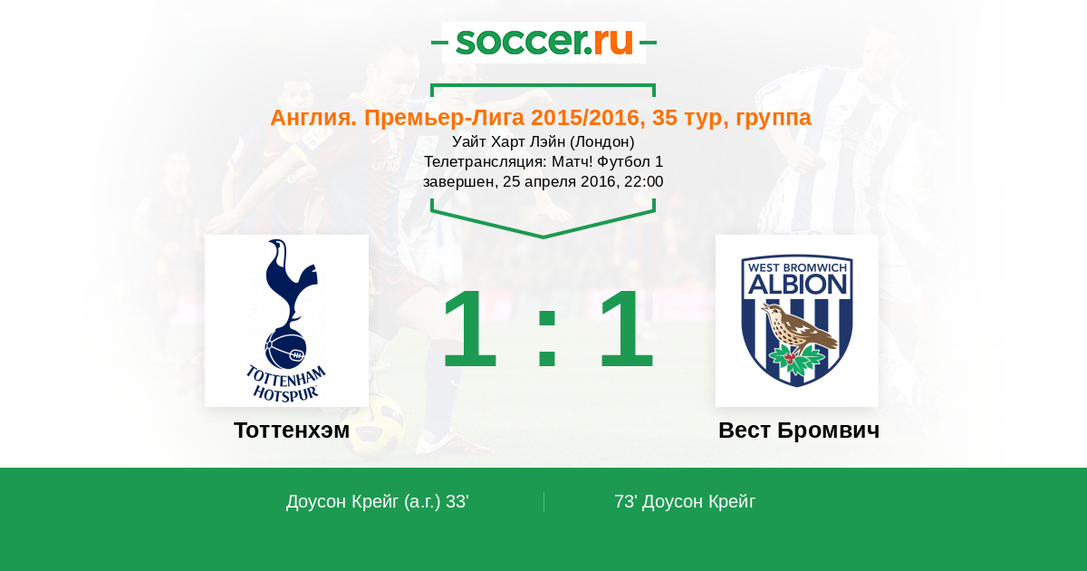 Доусон Крейг (25, з) - 1:0 (А) ГООЛЛЛ!!! Открывают счет "шпоры"! После подачи Эриксена Вертонген поборолся и подправил игровой снаряд в ворота "ВБА"! Мяч по пути еще задел Доусона, чем и помешал Майхиллу отбить мяч! 1:0!