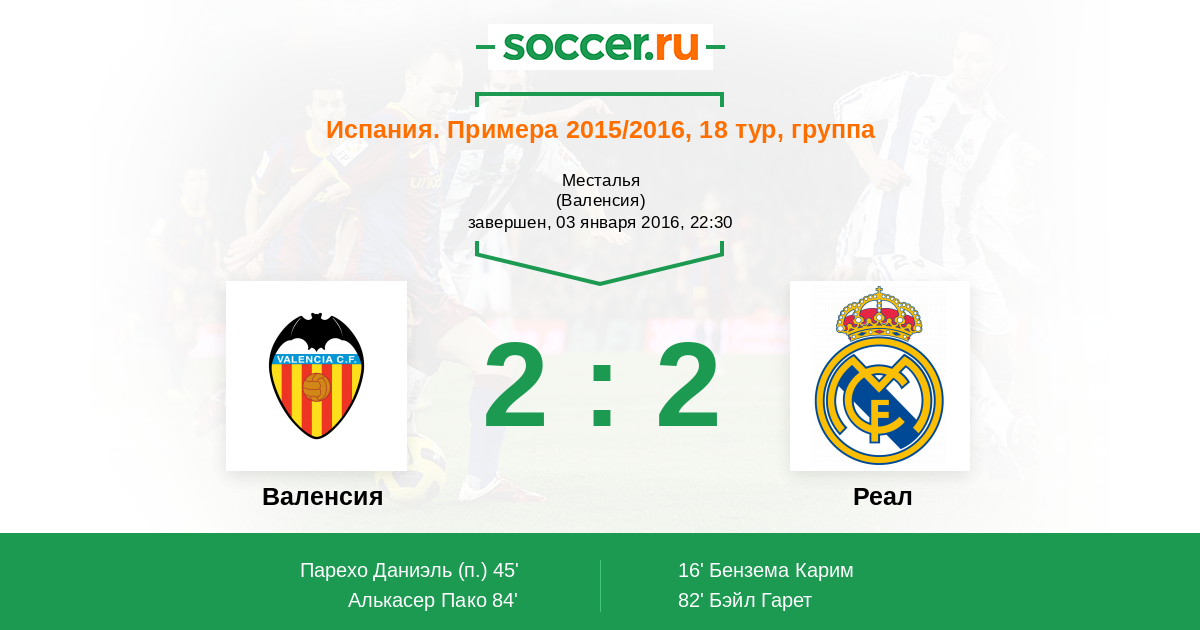 В этой встречи дважды "Реал" выходил вперёд, а "Валенсия" дважды отыгрывалась. Классную игру выдали команды с множеством моментов. Приглашаем поставить оценки игрокам матча https://www.soccer.ru/matches/ratings/987240.shtml. Комментировал матч для Вас Старчеус Сергей, оставайтесь с нами, до новых встреч на https://www.soccer.ru.