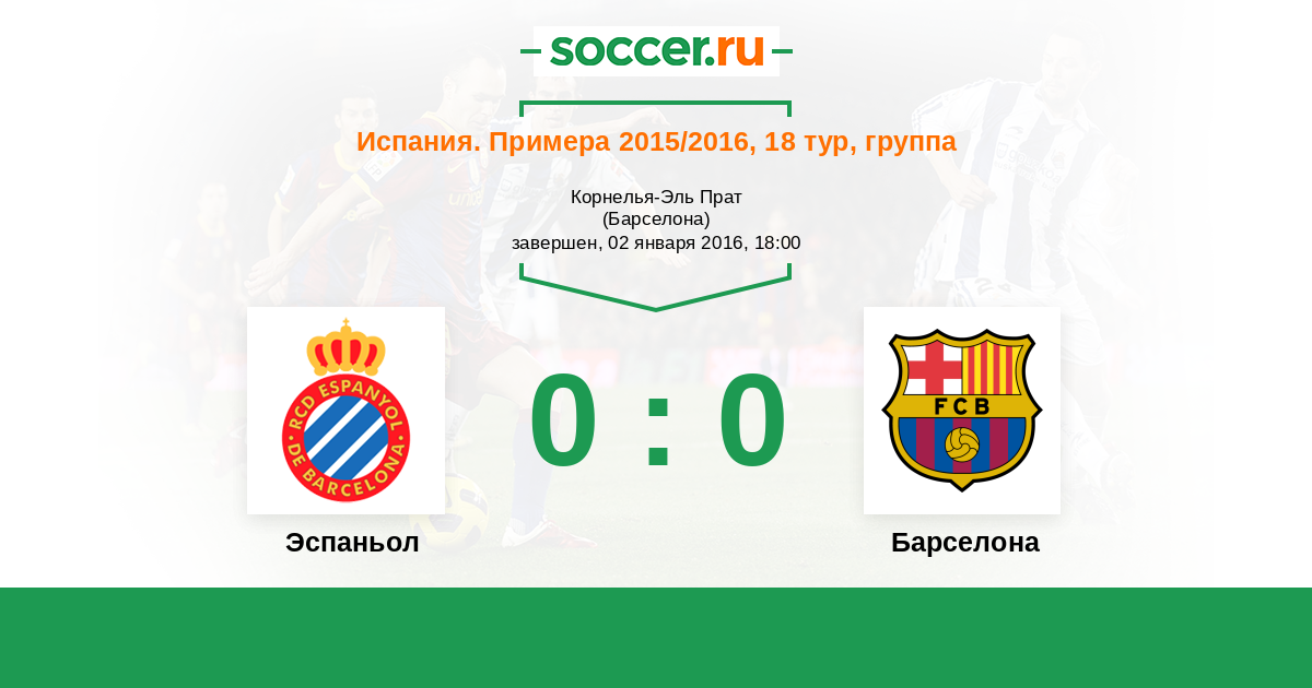 Добрый вечер уважаемые любители футбола! Этим январским вечером перенесёмся на стадион "Корнелья-Эль Прат", где в 18-м туре чемпионата Испании состоится каталонское дерби, в котором "Эспаньол" будет принимать лидера чемпионата - "Барселону"! Каталонские дерби, как правило, проходят в напряжённой борьбе, но "Барселона" сейчас находится в прекрасной форме и противостоять с ней на равных будет очень и очень непросто. Сайт https://www.soccer.ru проведёт прямую текстовую онлайн трансляцию матча, следить за событиями на поле и комментировать для Вас будет Старчеус Сергей.
