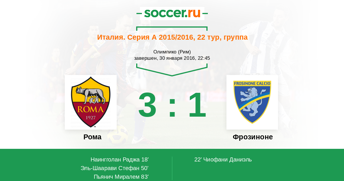 Добрый вечер всем поклонникам вида спорта №1 в мире! Приглашаем Вас на матч 22-го тура итальянской Серии А, в котором римская "Рома" будет принимать на своём поле скромный клуб "Фрозиноне". "Рома" буквально цепляется за зону еврокубков, имея довольно неплохие шансы по окончании сезона туда попасть, а вот "Фрозиноне" отчаянно борется за выживание в элите итальянского футбола, занимая лишь предпоследнее 19-е место в турнирной таблице. Сайт https://www.soccer.ru проведёт прямую текстовую онлайн трансляцию матча, следить за событиями на поле и комментировать игру для Вас будет Старчеус Сергей.