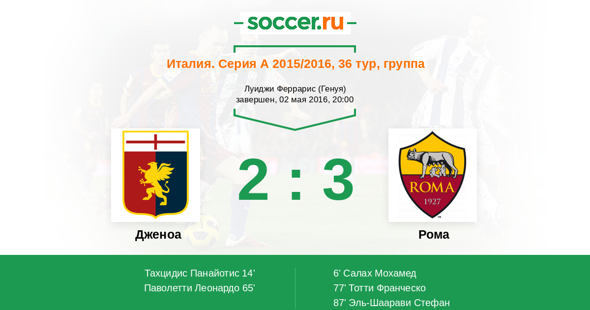 Все! Матч завершен! Римская "Рома" в невероятном поединке побеждает "Дженоа" на "Луиджи Феррарис" со счетом 3:2 и продолжает вести борьбу из "Наполи" за вторую позицию в турнирной таблице Серии А! Предлагаем вам поставить оценки футболистам за эту игру: https://www.soccer.ru/matches/ratings/988194.shtml. Для вас этот матч комментировал Андрей Бабенчук. Оставайтесь на https://www.soccer.ru/ !