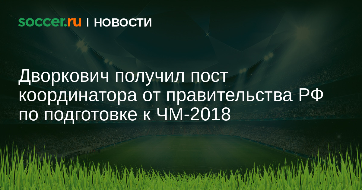 «Аркадий Дворкович назначен на должность координатора от правительства РФ по вопросам организации, подготовки и проведения чемпионата мира по футболу 2018 года. В этой роли он сменит другого вице-премьера правительства Виталия Мутко. Документ об изменении в распределении обязанностей был подписан председателем правительства Дмитрием Медведевым 3 марта».