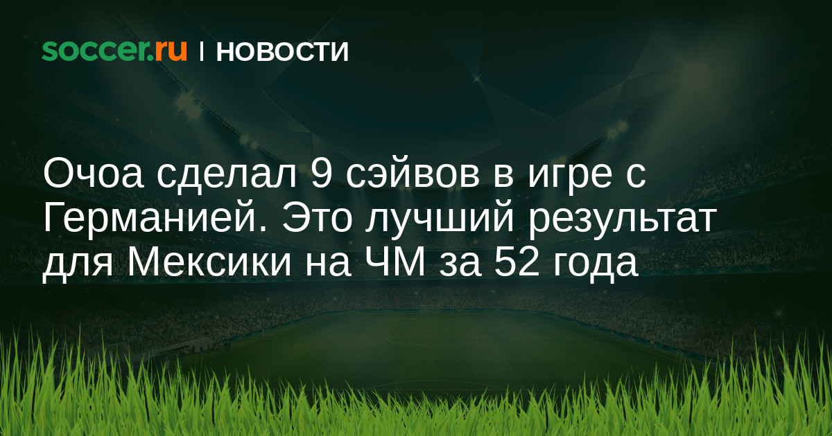 Вратарь сборной Мексики Гильермо Очоа отразил 9 ударов в створ своих ворот в матче чемпионата мира против Германии (1:0). Таким образом, Очоа показал лучший результат по сэйвам среди вратарей национальной команды Мексики на чемпионатах мира с 1966 года.