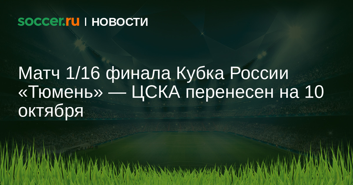 Матч 1/16 финала Кубка России «Тюмень» — ЦСКА перенесен с 26 сентября на 10 октября. Такое решение было принято по обоюдному согласию клубов в связи со сложным разъездным календарем обеих команд.