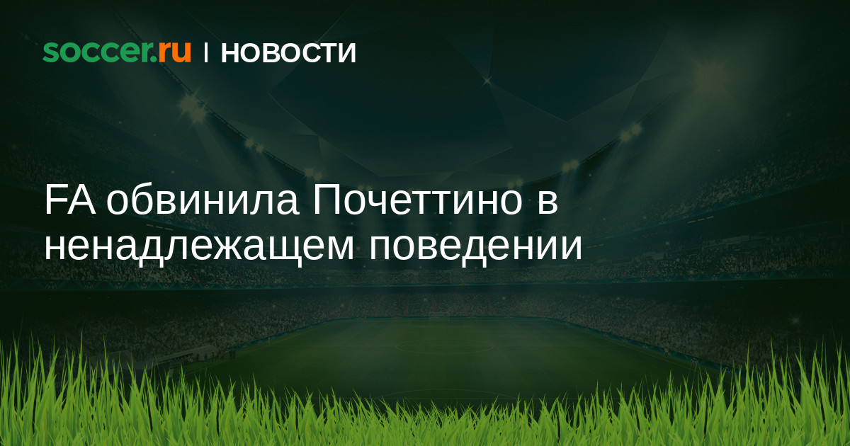 Футбольная ассоциация Англии (FA) выдвинула обвинения главному тренеру «Тоттенхэма» Маурисио Почеттино. В заявлении организации говорится, что слова и/или действия Почеттино на бровке и у подтрибунного помещения в конце субботнего матча с «Бернли» были приравнены к ненадлежащему поведению. Напомним, что ту игру подопечные аргентинца проиграли (1:2).