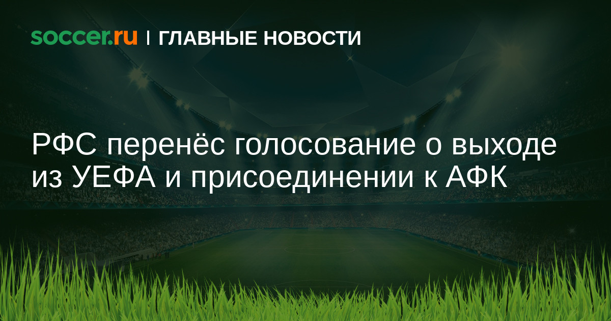 РФС принял решение перенести голосование исполнительного комитета по вопросу о выходе из УЕФА и переходу в АФК. Перенос связан с необходимостью проведения дополнительных консультаций, связанных с потенциальным переходом России в АФК. Планируется, что голосование пройдет до 31 декабря 2022 года.