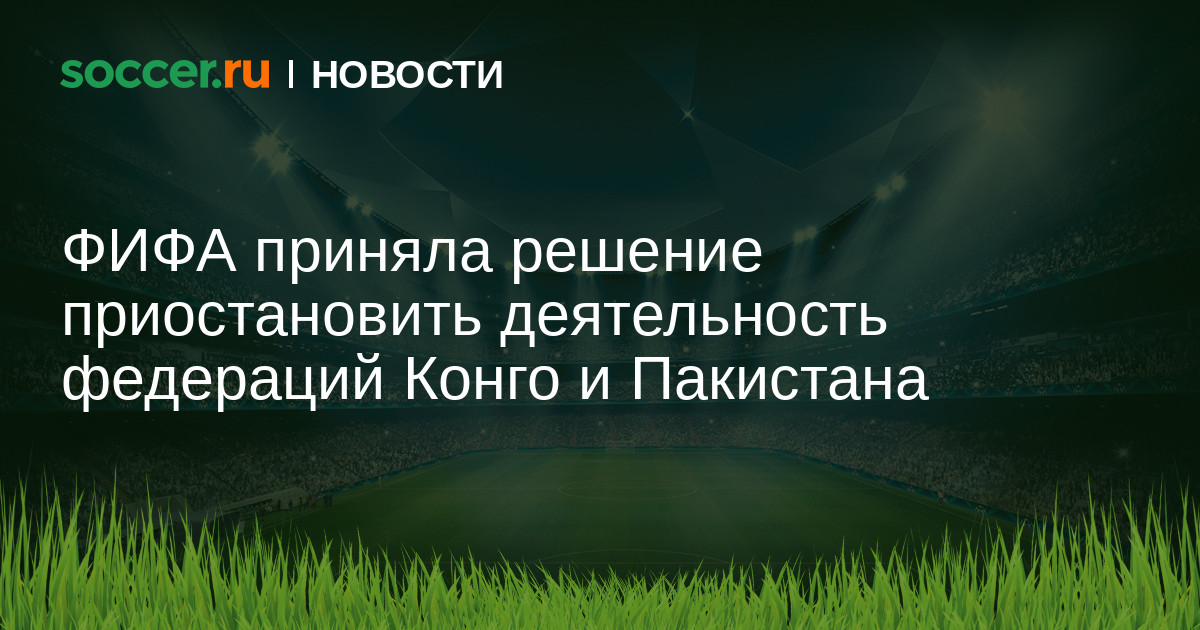 Бюро совета Международной федерации футбола (ФИФА) приняло решение немедленно приостановить деятельность Конголезской футбольной ассоциации (FECOFOOT) и Федерации футбола Пакистана (PFF), сообщается на сайте ФИФА.