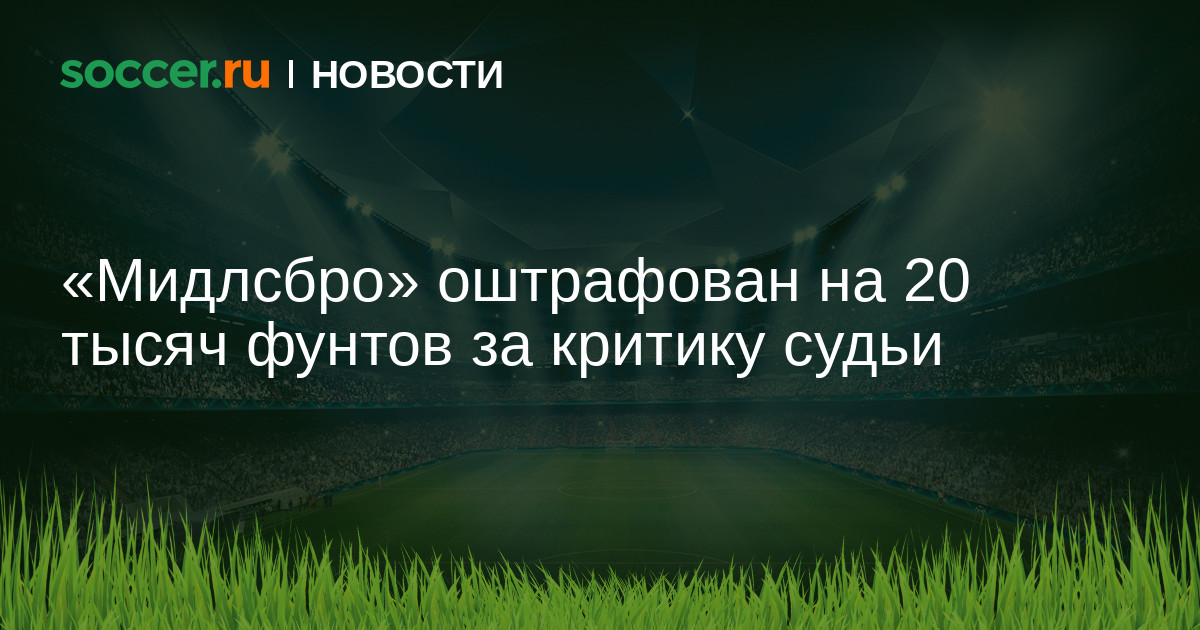Футбольная ассоциация Англии (ФА) оштрафовала «Мидлсбро» за критику игроков и тренеров команды в адрес главного судьи матча чемпионата Англии с «Манчестер Сити» (2:2) Кевина Френда. Игроков возмутило назначение пенальти в пользу «Сити», и они бурно и гневно отреагировали на действия судьи. За это ФА оштрафовала «Мидлсбро» на 20 тысяч фунтов стерлингов.
